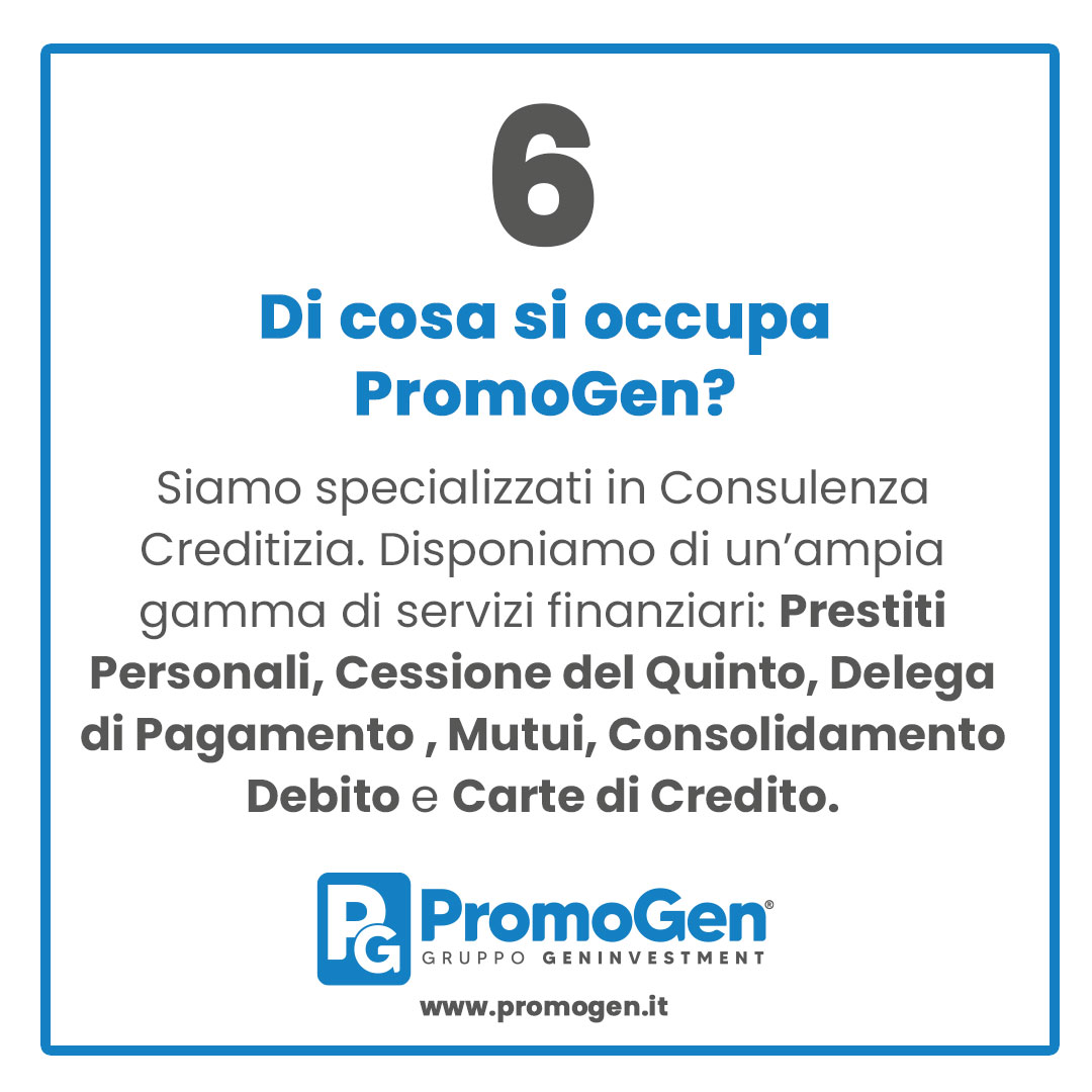 PromoGen è un’agenzia finanziaria specializzata nella consulenza creditizia ed offre un’ampia gamma di servizi finanziari: Prestiti Personali, Cessione del Quinto, Delega di pagamento, Mutui, Consolidamento Debiti e Carte di Credito.